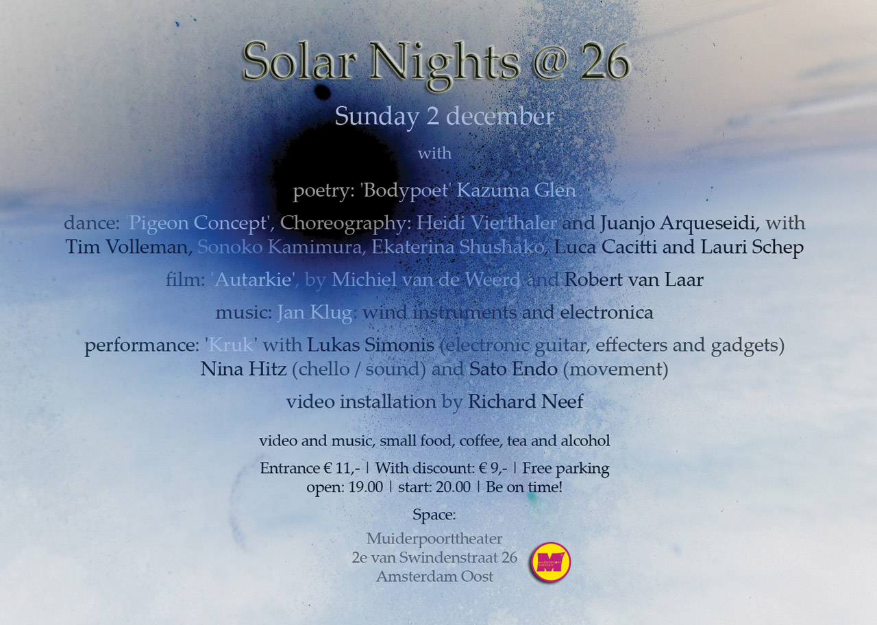 performance: 'Kruk' with Lukas Simonis (electronic guitar, effecters and gadgets) Nina Hitz (chello / sound) and Sato Endo (movement)